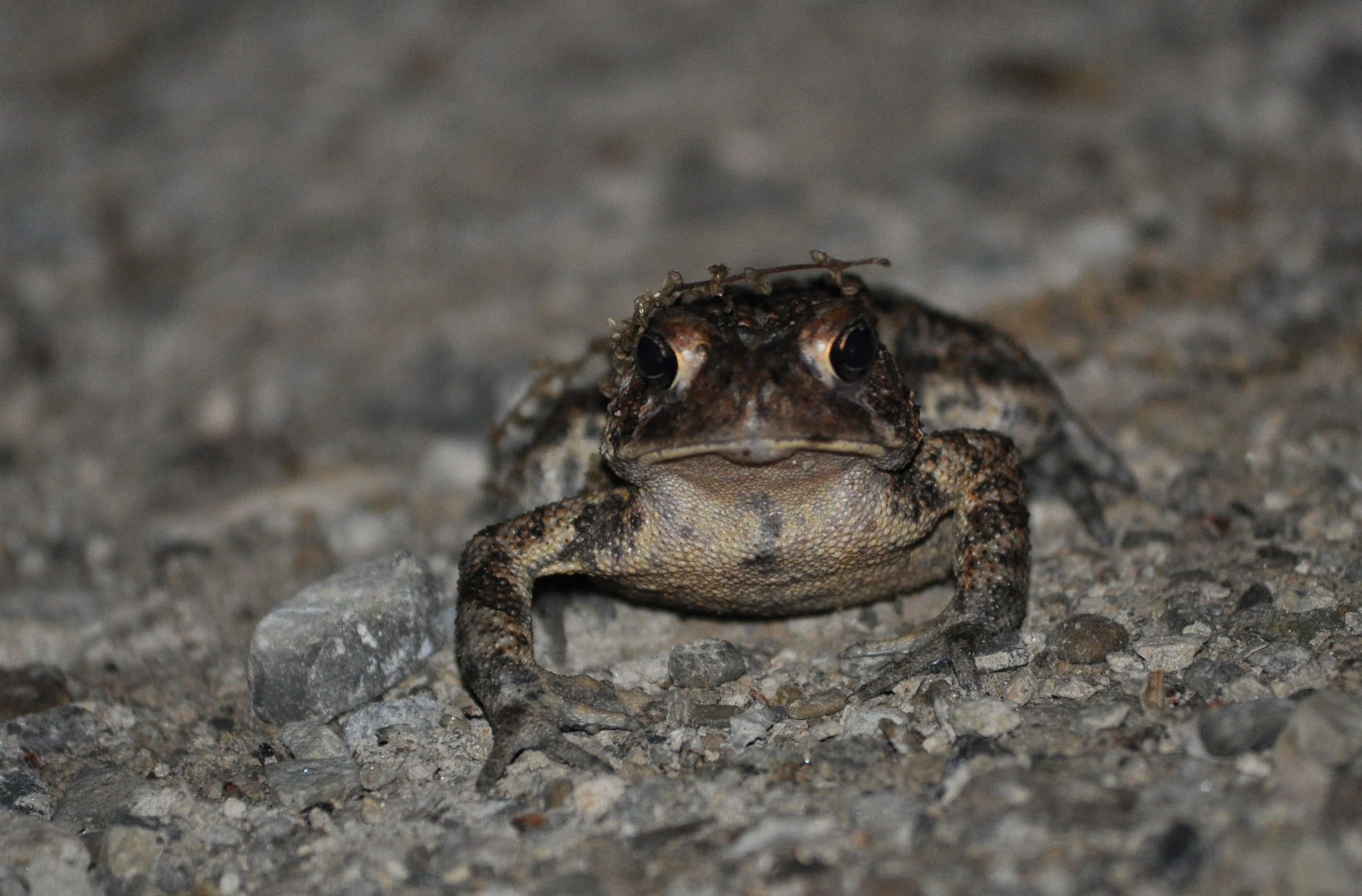 Last week, I went to Bradley Woods while the sun was going down. On a path, I found a toad using seaweed on his head as camouflage.